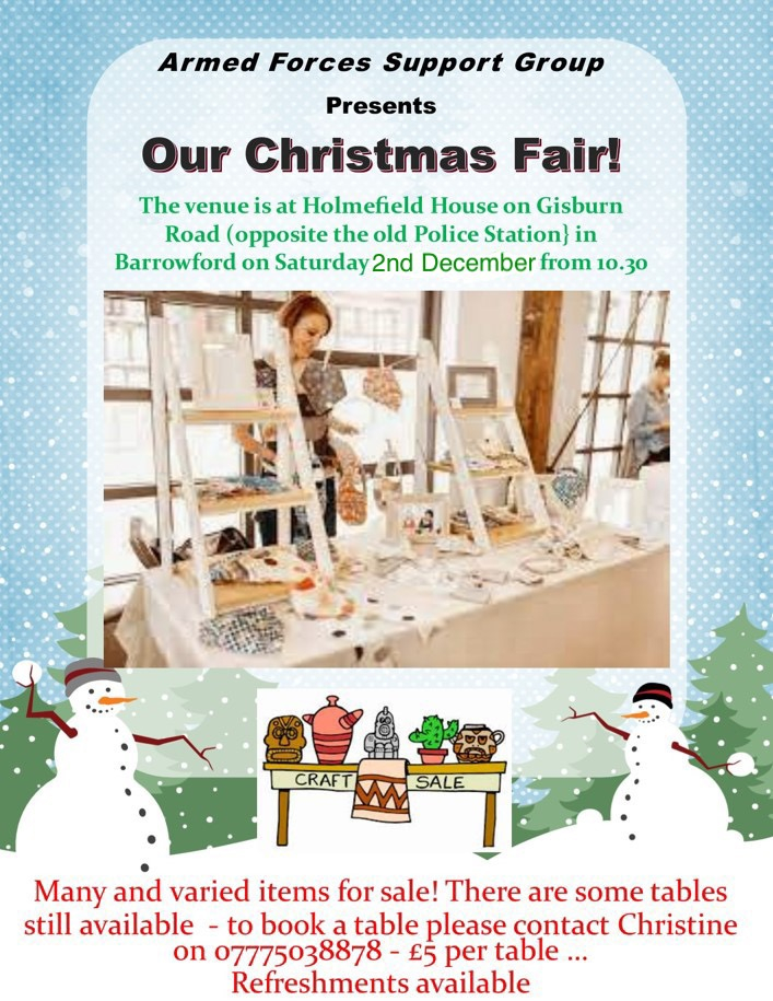 The Armed Forces Support Group (AFSG) Ladies section is hosting a Christmas Fair at Holmefield House, Gisburn Rd., Barrowford on Saturday 2nd December - the items available are many and varied ranging from arts and crafts through to raffles, hampers, books etc etc and refreshments and light bites will be available - admission is free! Money raised goes towards maintaining our office at Holmefield House, we also support the local Cadet Forces, the Police Cadets and we contribute to the 3  Military Benevolent Funds (Army, Navy & Air Force) plus Serving or Veterans are helped in hardship cases or signposted to more specialised help if required - all in all its a very worthwhile cause and YOUR contribution will help us maintain this effort that our unpaid, local volunteers have carried out for the past 20 years ...